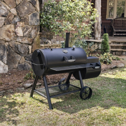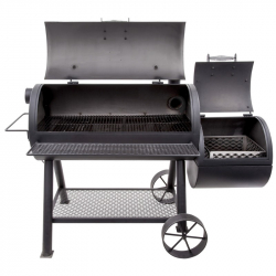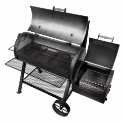 Самая большая реверсная коптильня Oklahoma Joe's®. Коптильная камера снабжена дополнительными пластинами, разворачивающими (reverse) поток дыма в обратную сторону для более равномерного распределения температуры в камере. При желании можно снять пластины и переставить вытяжную трубу, превратив эту модель в классический офсетный смокер.