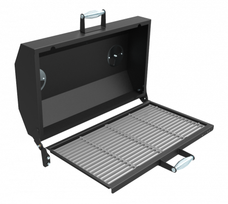 Крышка откидная, на шарнирах, с рукояткой, с ограничителем хода крышки, с вентиляционными заслонками и термометром.