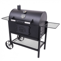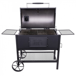 Серьезный угольный гриль. Серьезный вес - 90 кг. Массивная, основательная конструкция с боковыми пристольями и нижней полкой. Классическая чугунная решетка. На крышке установлен крупный, легкочитаемый термометр и ненагревающаяся ручка. Котел снабжен нижней заслонкой поддува и широкой дверцей для "управления" углем.