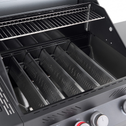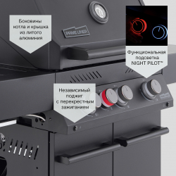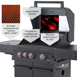 Мощные запатентованные турбогорелки BLADE разгоняют гриль до 300 градусов за 10 минут. В левом пристолье установлена боковая инфракрасная горелка BROIL ZONE. Как и у всех топовых грилей, основная решетка выполнена из нержавеющей стали толщиной 8 мм.