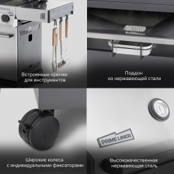 Плюс все классические фишки продвинутого гриля - двойная крышка котла с боковинами из литого алюминия, поддон жиросборника из нержавеющей стали, встроенные крючки для инструментов и усиленные прорезиненные колеса с фиксаторами. Вставки лотка-жиросборника (3шт.) уже в базовой комплектации.