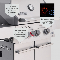 Мощные запатентованные турбогорелки BLADE™ разгоняют гриль до 300 градусов за 10 минут. В левом пристолье установлена боковая инфракрасная горелка BROIL ZONE™. Как и у всех топовых грилей, основная решетка выполнена из нержавеющей стали толщиной 8 мм.